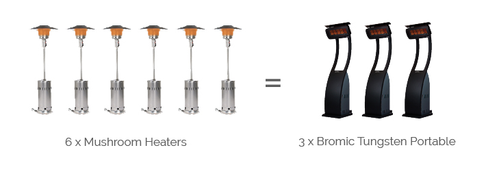 Draagbare verwarmingstoestellen gaan ongeveer 10,5 uur mee op een enkele tank van 10,5 kg LPG, afhankelijk van het vermogen van het verwarmingstoestel (gewoonlijk tussen 30 en 40 MJ). Aangezien een tank ongeveer €39,- per navulling kost, lopen de kostenvoordelen van een draagbare Tungsten van Bromic snel op! Een café-restaurant bijvoorbeeld, dat momenteel 6 verwarmingselementen voor champignons heeft geïnstalleerd, kan elke dag ongeveer 58 euro besparen, ervan uitgaande dat één tank propaan goed is voor ongeveer 2 diners.