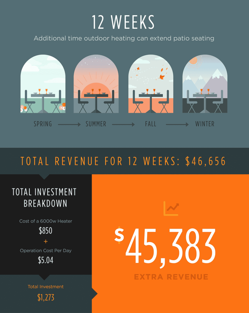 Door uw klanten een veilige, comfortabele en warme omgeving te bieden, kunnen buitenverwarmers uw buitenseizoen met tot 12 extra weken verlengen en meer dan 45.000 dollar* aan extra inkomsten genereren. Download onze infografiek om uit te vinden hoe!